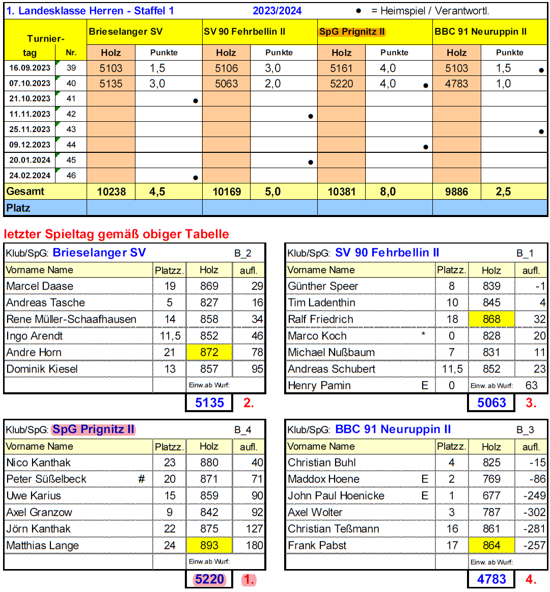 In der Gesamtwertung führt die ungeschlagene Karstädt/Perleberger Spielgemeinschaft mit nun 8 Punkten vor dem SV 90 Fehrbellin II (5), Brieselanger SV (4,5) und BBC '91 Neuruppin II (2,5).