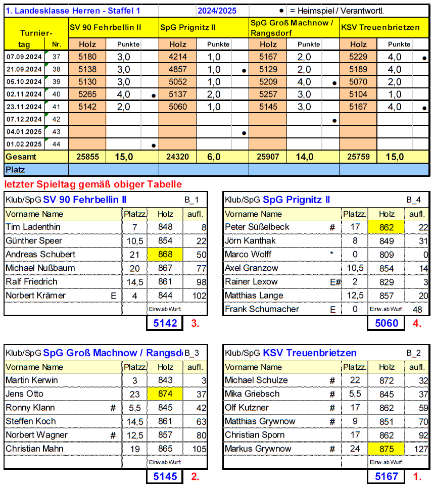 Den Tagessieg sicherte sich der Gastgeber KSV Treuenbrieten mit 5167 Holz vor der SpG Groß Machnow/Rangsdorf (2. Platz/5145 Holz) und dem SV 90 Fehrbellin II (3./5142). Die 3 Teams trennt in der Gesamtwertung lediglich 1 Punkt, sodass an der Tabellenspitze weiterhin mit Spannung zu rechnen ist.