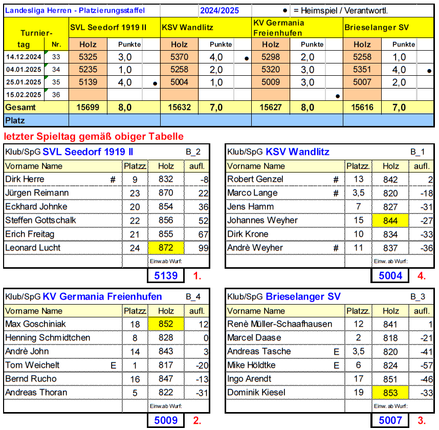 Unter der Annahme, dass Freienhufen sein Heimspiel am 15. Februar in Großräschen gewinnt, muss der KSV Wandlitz beim Saisonfinale unter allen Umständen bezwungen werden, da die Barnimer auf neutralen Bahnen einen Punkt Vorsprung vorweisen. Das Gegenteil trifft im Duell mit dem Brieselanger SV zu. Hier können die SVLer auf neutralen Bahnen 2 Punkte mehr aufweisen, sodass die Havelländer für den Klassenerhalt 2 Punkte gegenüber den Seedorfern aufholen müssen. Will man am Löcknitzstrand das große Rechnen vermeiden, muss Platz 2 hinter den Gastgebern oder der Tagessieg her.